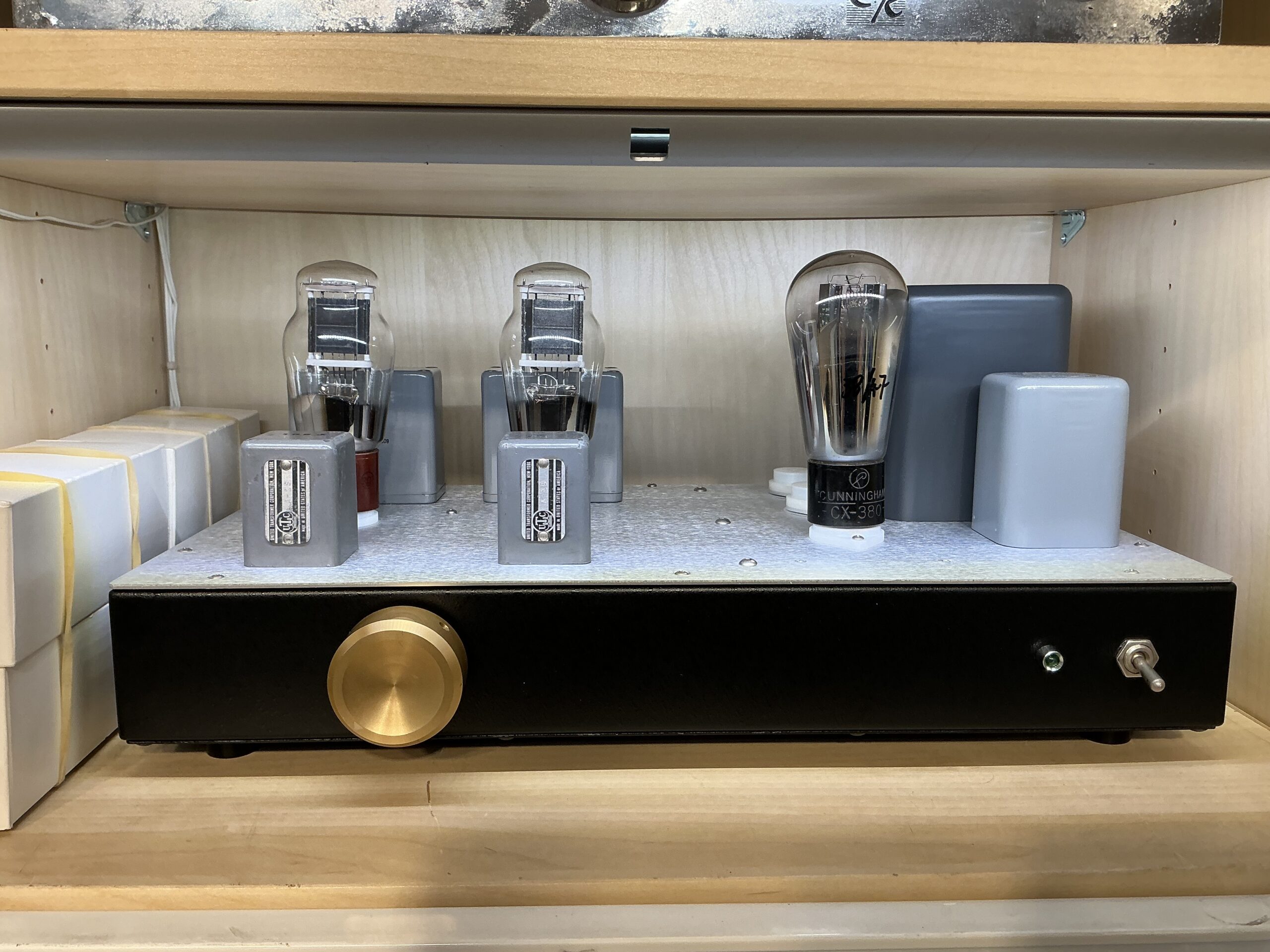 This unit is specially modified to use 845 power tubes to give output power more than 10W. Switching power supply supply the filament of the 845 tubes enable the use of such a small casing. The hum level is very low and there is no need for adjustment.